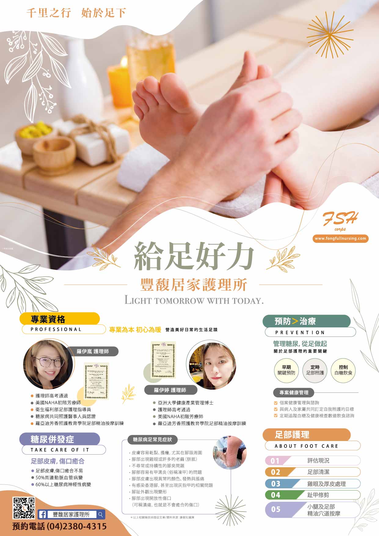 豐馥居護的護理師以專業為本、初心為暖,為您營造美好日常的生活足蹟,預防勝於治療,管理糖尿從足做起,豐馥居護將提供您「專案健康管理」,不單單是一次的足部護理,而是終身的管理與諮詢。